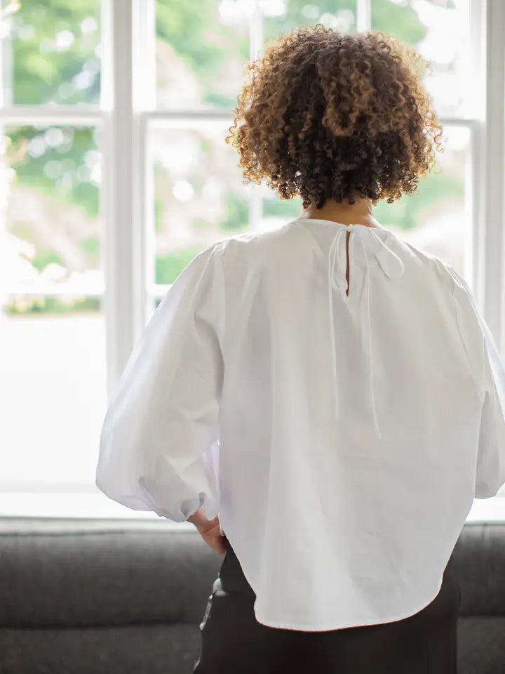 The Penelope shirt is a voluminous long-sleeve blouse. Featuring elastic cuffs which give a flattering, puffed sleeve effect, it also has a round neck with a charming tie-back detail for a touch of elegance. Not only does this shirt look stunning on its own, why not layer it up with a tunic top, jumper or poncho, to elevate your wardrobe and making this your go to, any season item.